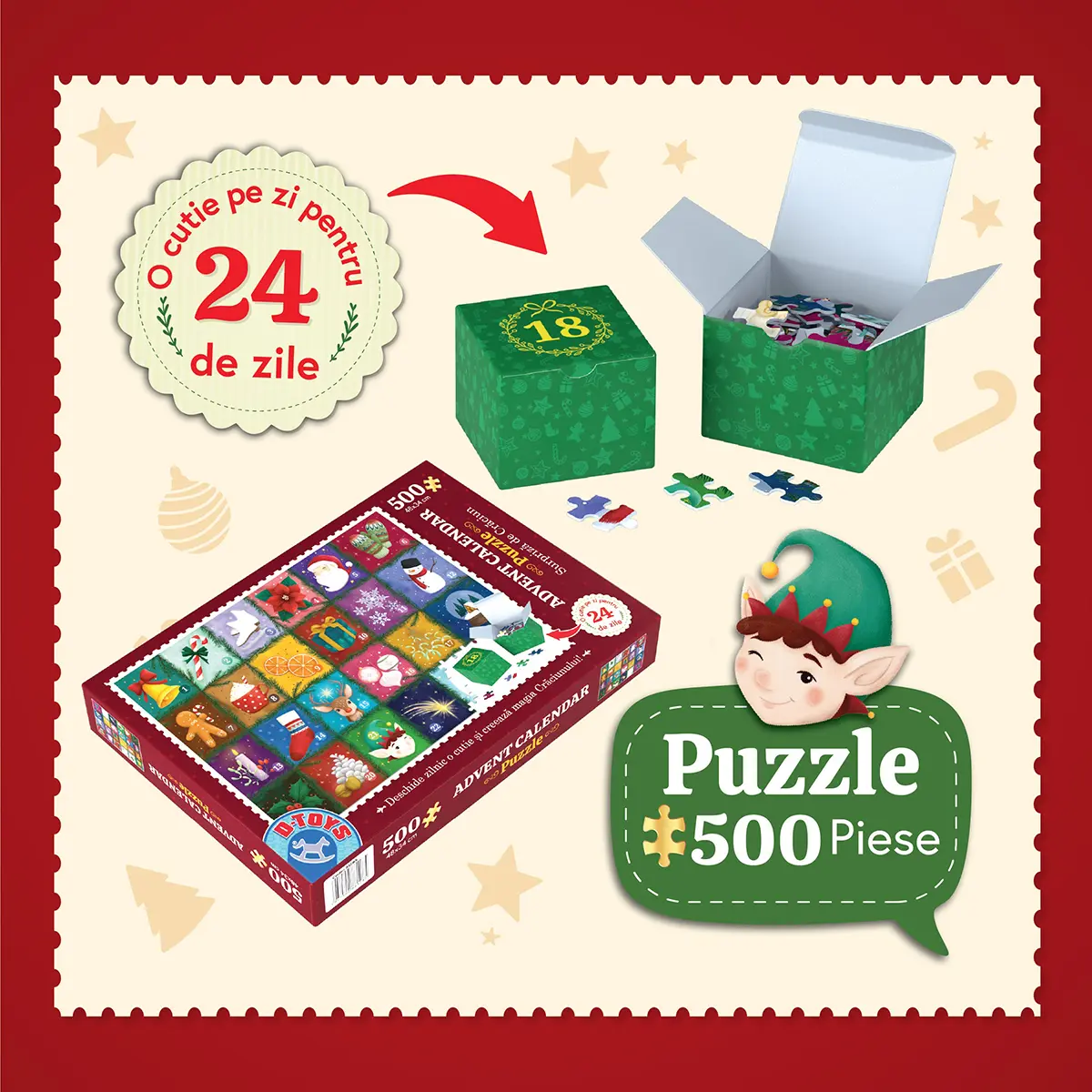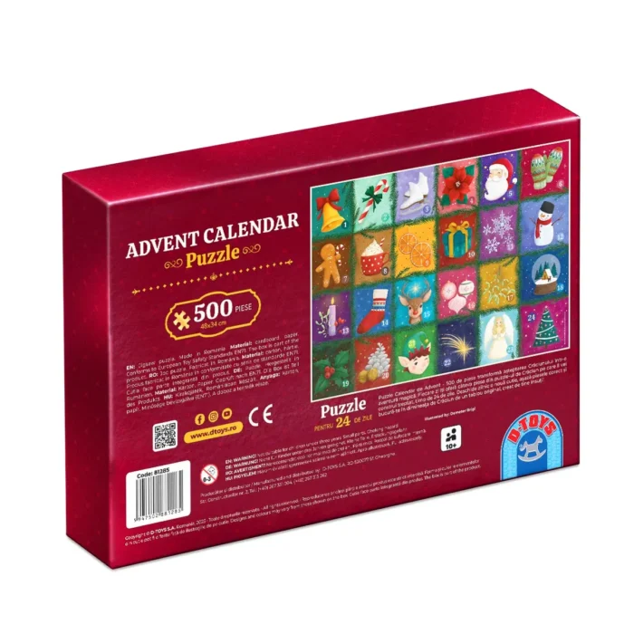 Conceput pentru a fi asamblat treptat, Advent Calendar Puzzle – 500 de piese transformă așteptarea Crăciunului într-o experiență unică și relaxantă. Fiecare zi de Advent aduce o nouă provocare ce completează puțin câte puțin imaginea cu tematică de sărbătoare care va fi gata în ziua de Crăciun.