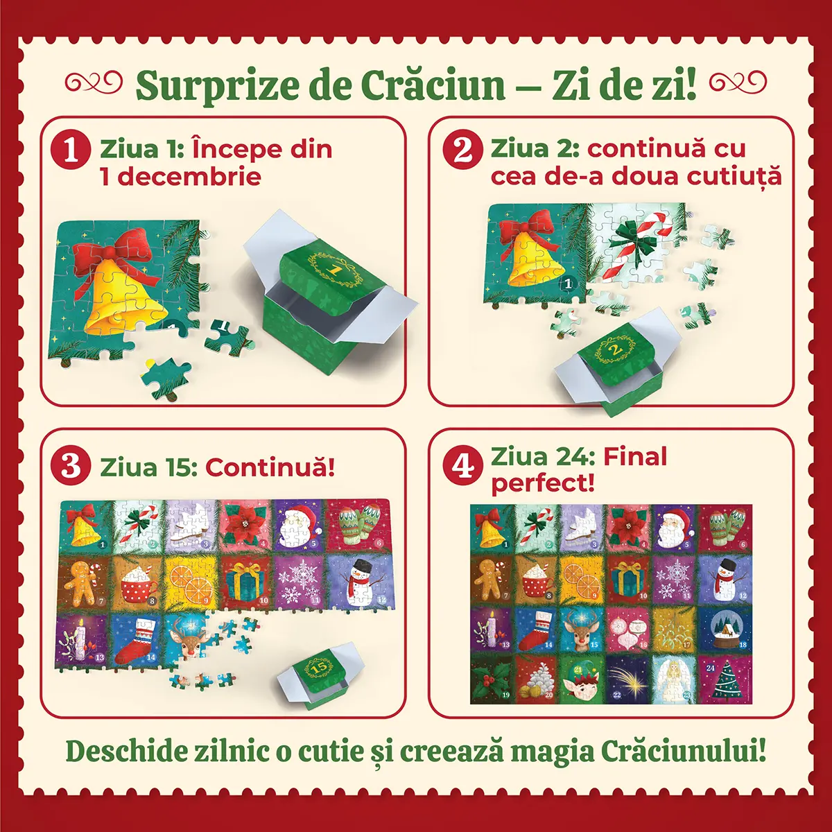 Oferă-le copiilor Advent Calendar Puzzle – 500 de piese și completați împreună imaginea în toate cele 24 de zile de dinaintea Crăciunului, transformând perioada de Advent în momente prețioase de bucurie și conectare autentică.