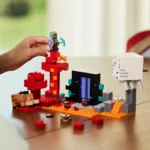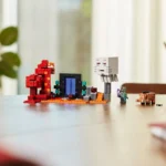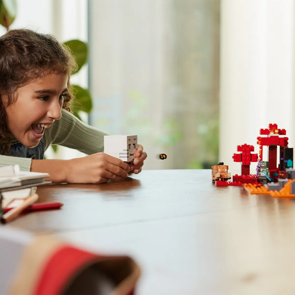 Această jucărie de construcție pentru copii include o figurină războinic orc cu un skin personalizat, care călătorește printr-un portal Minecraft Nether până la frontiera dintre Pădurea Purpurie și Deltele de Bazalt. Pe măsură ce jucătorii explorează copacii plini cu ciuperci ai pădurii, trebuie să înfrunte o serie de mobi populari din joc: 2 cuburi de magmă, un hoglin al cărui cap este controlat de deget pentru a lovi și o figurină ghast Minecraft care lansează discuri din gură. Pentru mai multă adrenalină, ostilul ghast are reputația de a distruge portaluri, blocându-i înăuntru pe jucători pentru totdeauna! Micii constructori vor adora și aplicația LEGO Builder, care le permite să apropie și să rotească modelele în 3D și să-și monitorizeze progresul.
