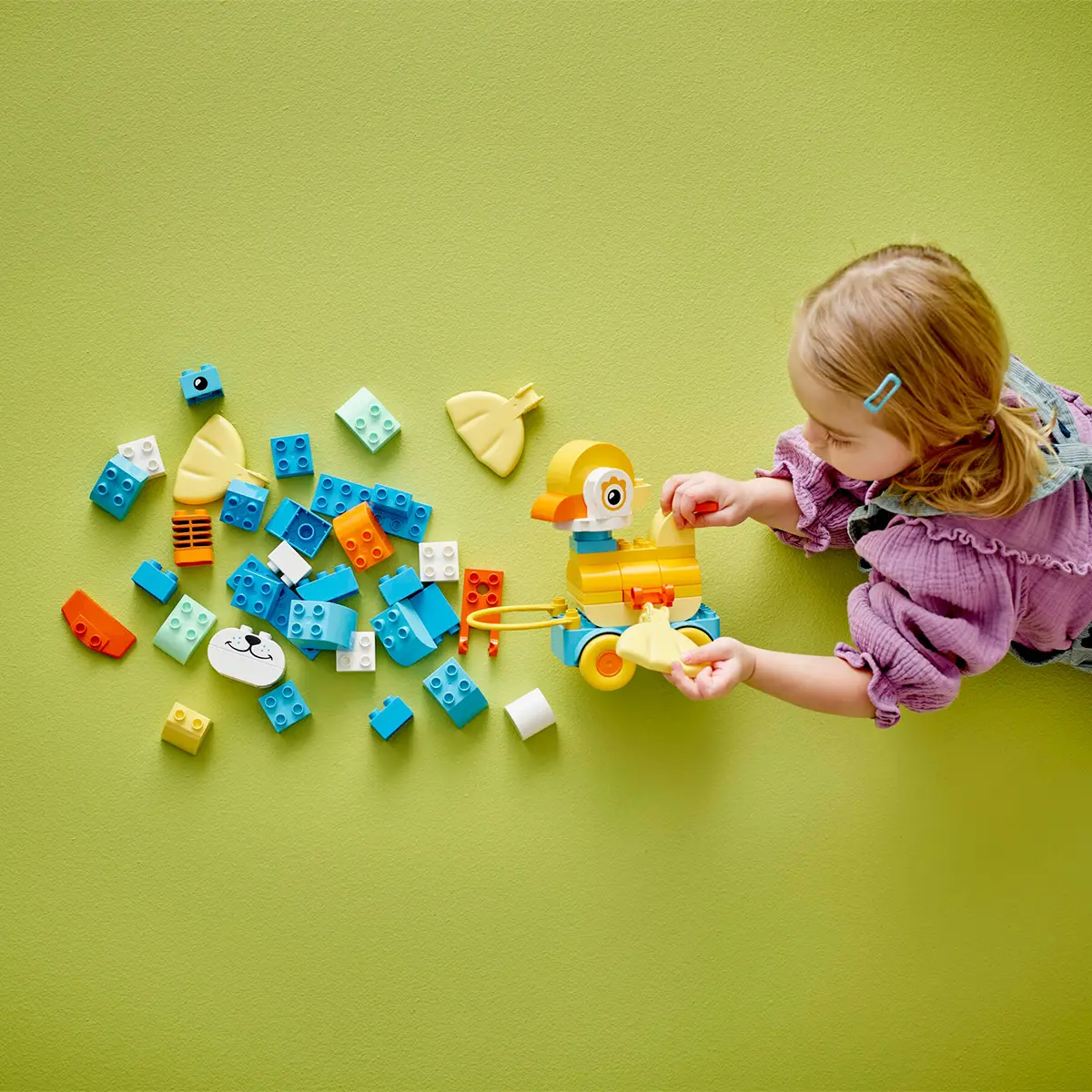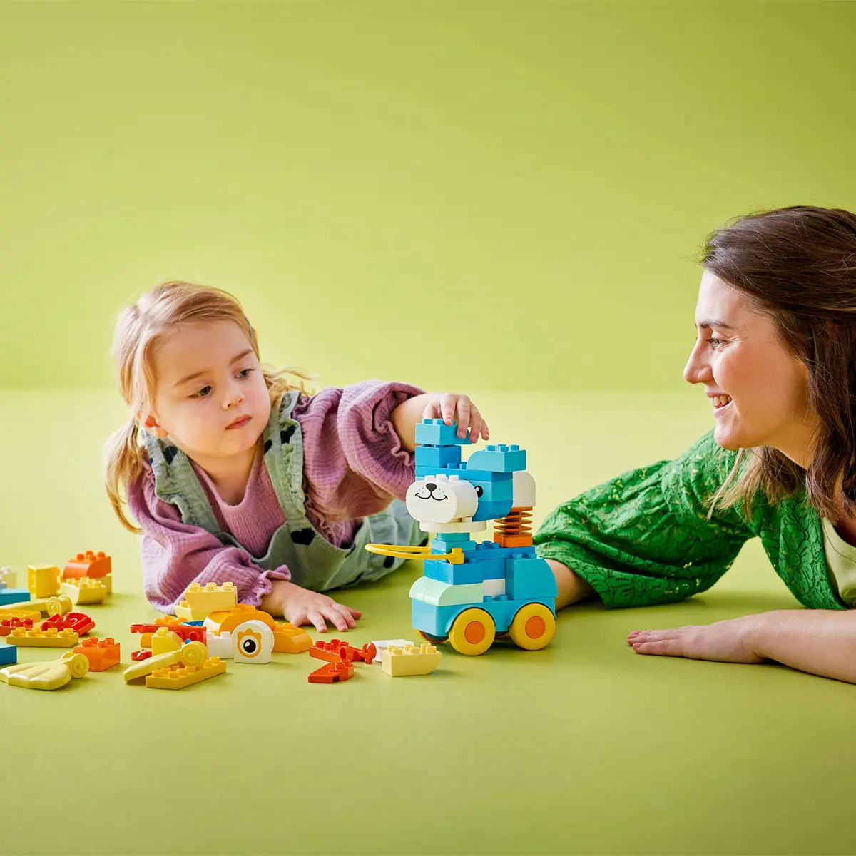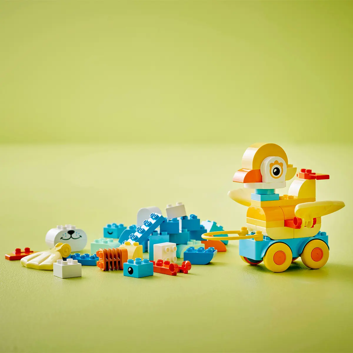 Micii iubitori de animale vor descoperi nenumărate modalități de a se bucura de joaca fantezistă construind rățușca, peștele sau câinele sau chiar creând animale complet noi. Preșcolarii care adoră vehiculele de jucărie LEGO® DUPLO® construiesc figurinele pe o bază cu roți și se distrează să-și pună animalele în mișcare prin împingere sau prin tragere de un mâner.