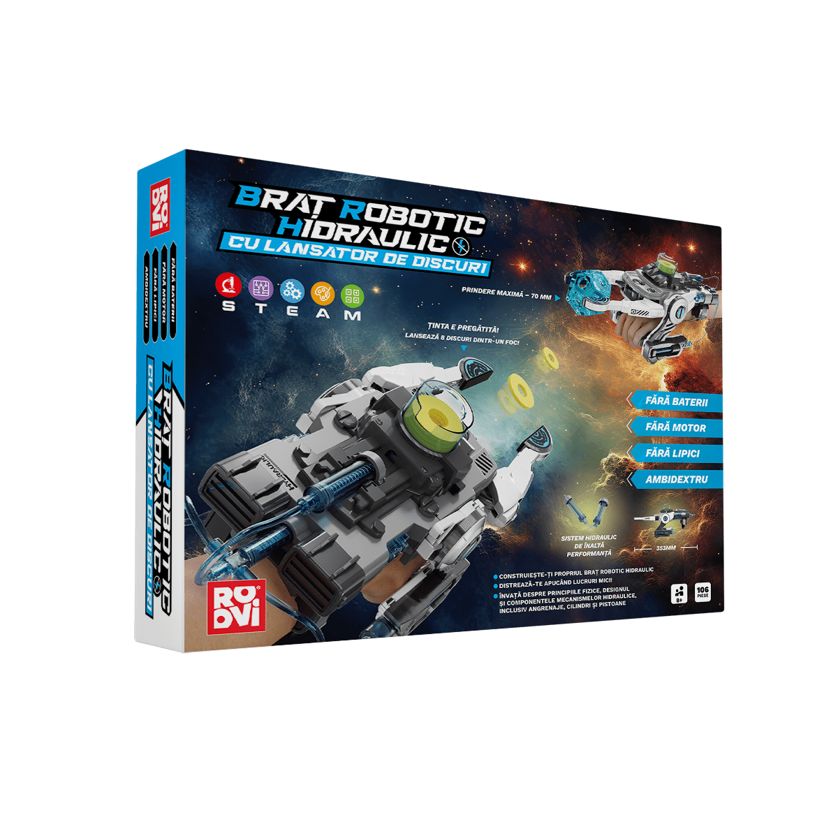 Dacă îți dorești o experiență educativă completă care să trezească sau să amplifice pasiunea pentru știință și tehnologie a copilului tău, Brațul Robotic Hidraulic cu lansator de discuri este alegerea perfectă. Setul include 16 discuri zburătoare. Vârsta potrivită: 8+