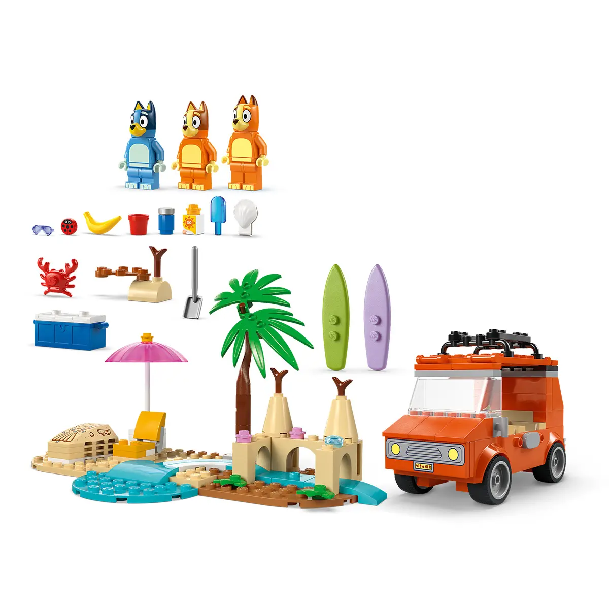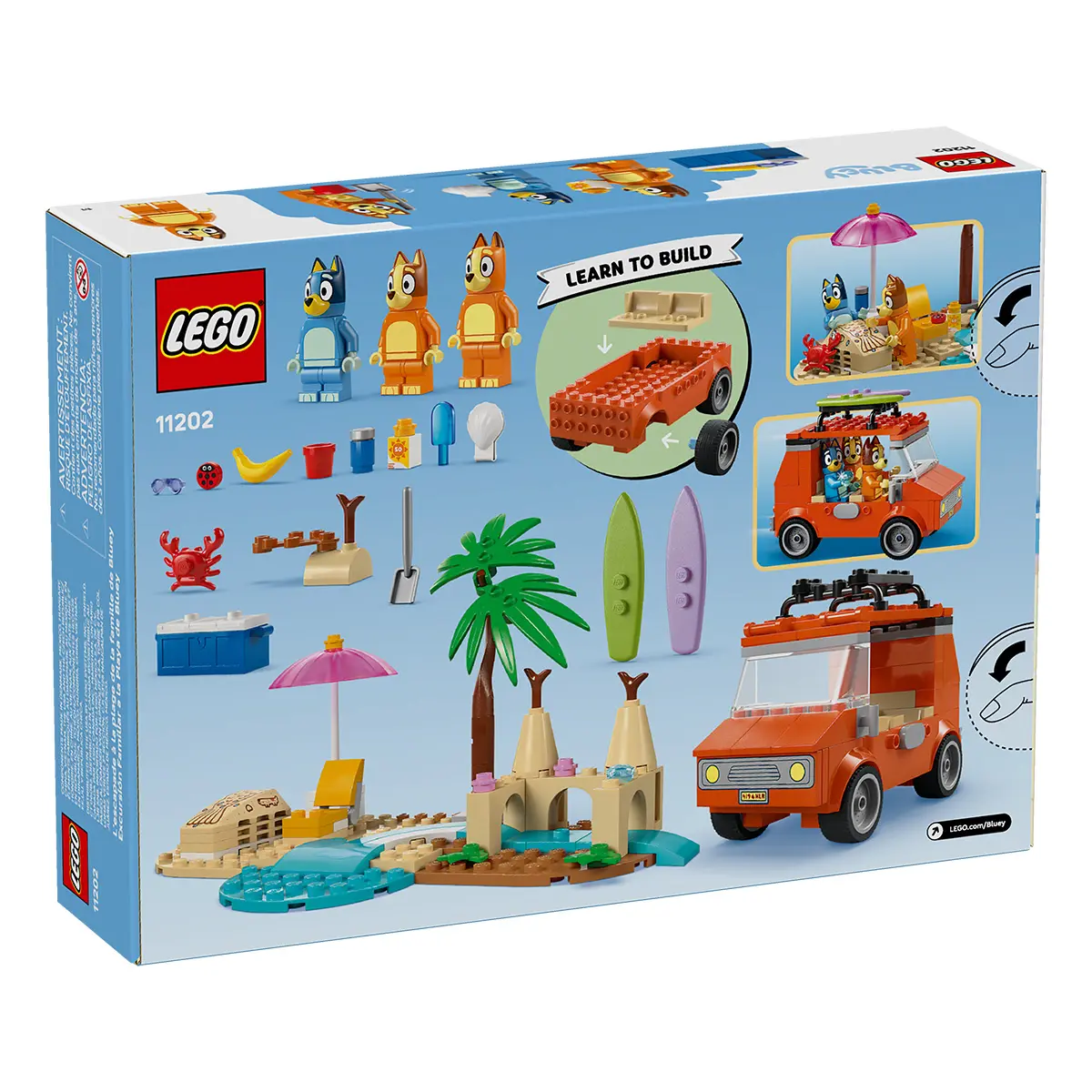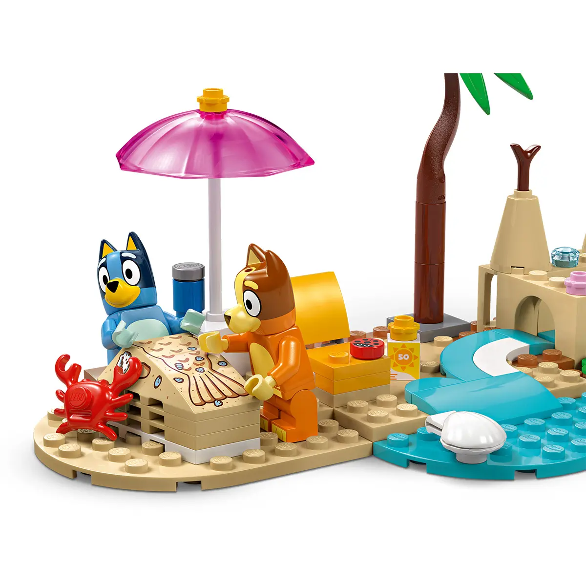Această jucărie LEGO® include emblematicul vehicul din serialul Blue, cu 2 plăci de surf atașate în partea superi oară și un portbagaj în spate pentru a transporta lada frigorifică. Acoperișul rabatabil al mașinii oferă copiilor acces ușor la interior, unde există scaune pentru minifigurinele Blue, Bingo și Chilli (mama lui Blue). Dotările de pe plajă care inspiră joaca fantezistă includ un castel de nisip impresionant, o coadă de sirenă din nisip în care poate încăpea o minifigurină, un șezlong pliabil, o umbrelă de soare și un palmier. Accesoriile includ un crab, o înghețată, ochelari de soare și cremă de protecție solară.