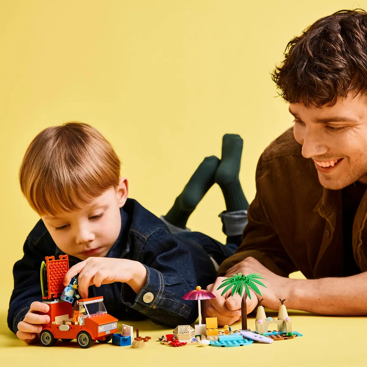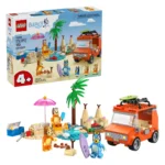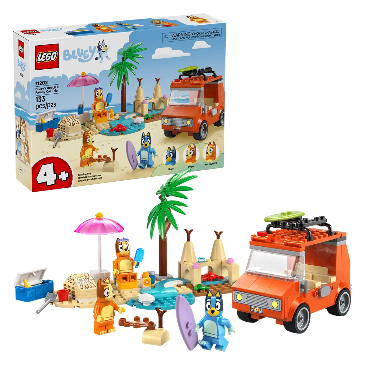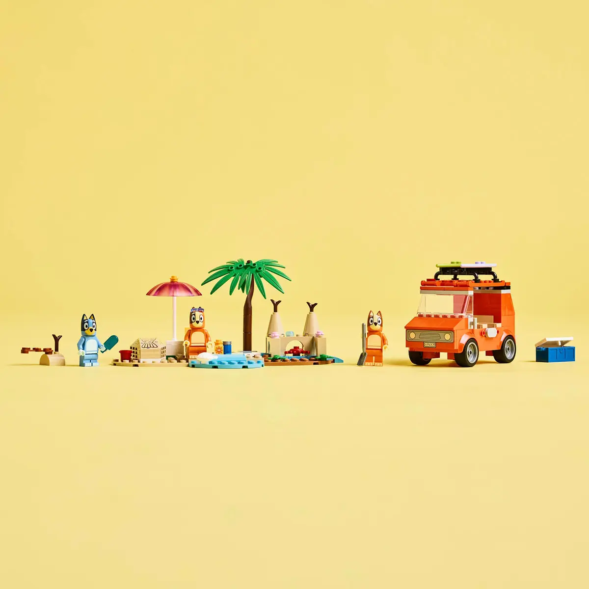 Această jucărie LEGO® include emblematicul vehicul din serialul Blue, cu 2 plăci de surf atașate în partea superi oară și un portbagaj în spate pentru a transporta lada frigorifică. Acoperișul rabatabil al mașinii oferă copiilor acces ușor la interior, unde există scaune pentru minifigurinele Blue, Bingo și Chilli (mama lui Blue). Dotările de pe plajă care inspiră joaca fantezistă includ un castel de nisip impresionant, o coadă de sirenă din nisip în care poate încăpea o minifigurină, un șezlong pliabil, o umbrelă de soare și un palmier. Accesoriile includ un crab, o înghețată, ochelari de soare și cremă de protecție solară.