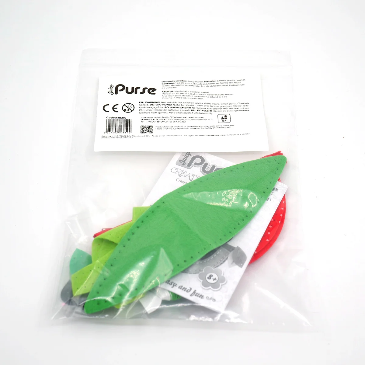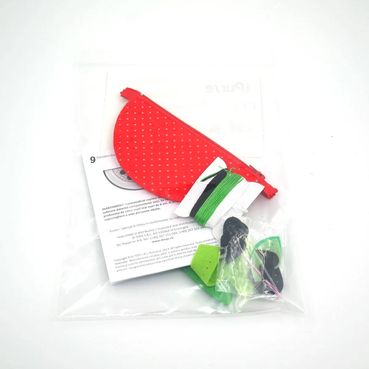 Un set creativ și distractiv cu ajutorul căruia se poate confecționa o poșetă superbă, în formă de pepene. Setul include materiale textile și din plastic pentru realizarea poșetei. Dimensiunile produsului final: aproximativ 15 x 8 x 6 cm (lungime/lățime/înălțime).