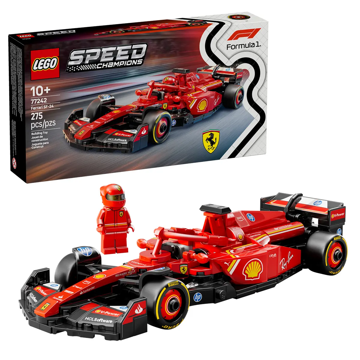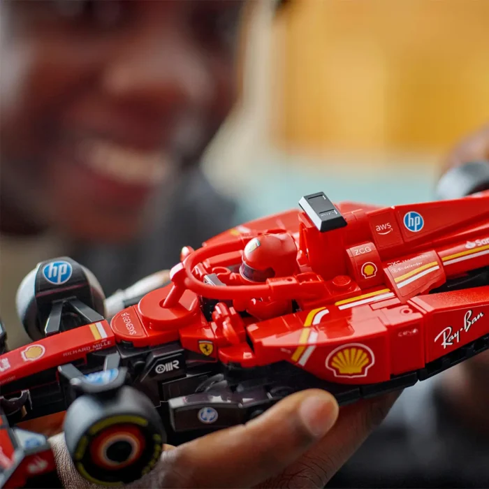Construit cu atenție la detalii, modelul surprinde caracteristici emblematice precum aripa spate, sistemul de protecție Halo, anvelopele spate late cu inscripția Pirelli și cockpitul care se deschide. Minifigurina pilot inclusă poartă o ținută oficială Ferrari și poate fi așezată la volan pentru a porni în curse imaginare de neuitat.