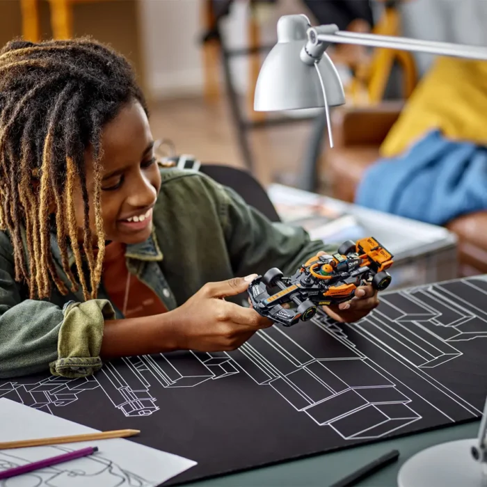 Modelul de vehicul McLaren include o mulțime de dotări realiste: culorile caracteristice negru și papaya, logourile sponsorilor echipei, roțile cu imprimeuri Pirelli și sistemul de protecție halo în culoarea papaya. Kitul cu mașină construibilă mai are și o minifigurină pilot pe care copiii o pot plasa la volan pentru a imagina curse palpitante.