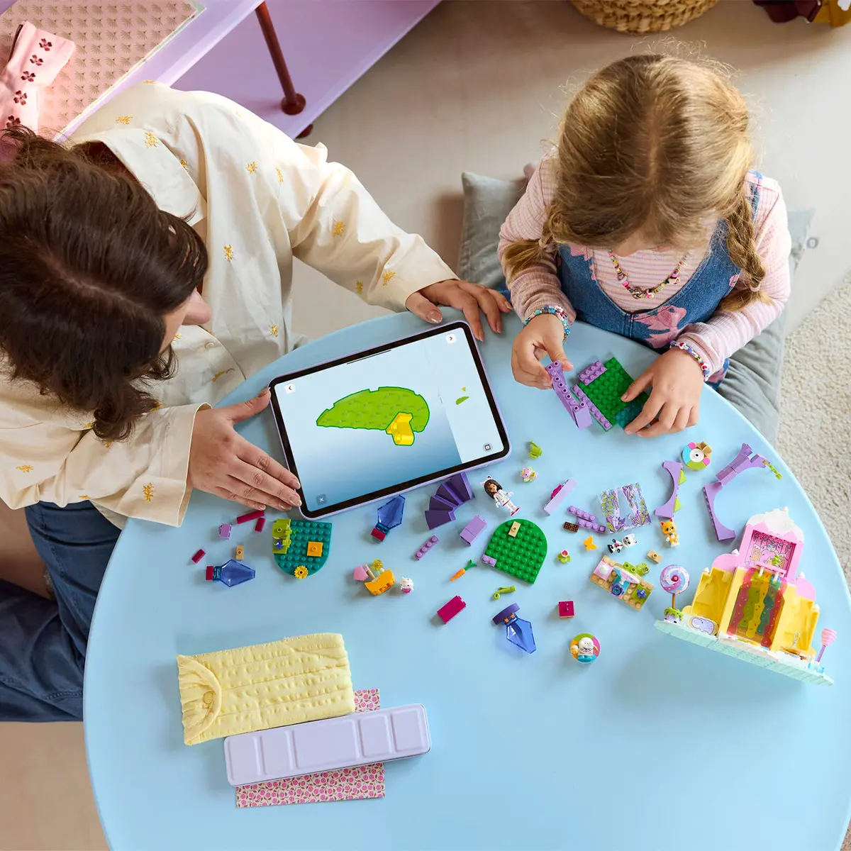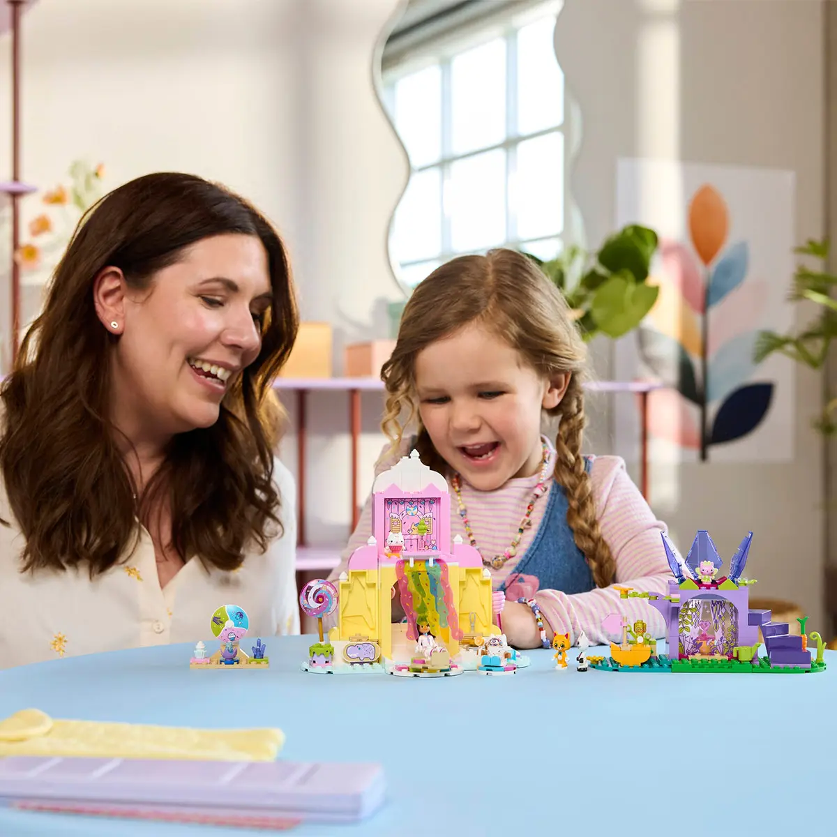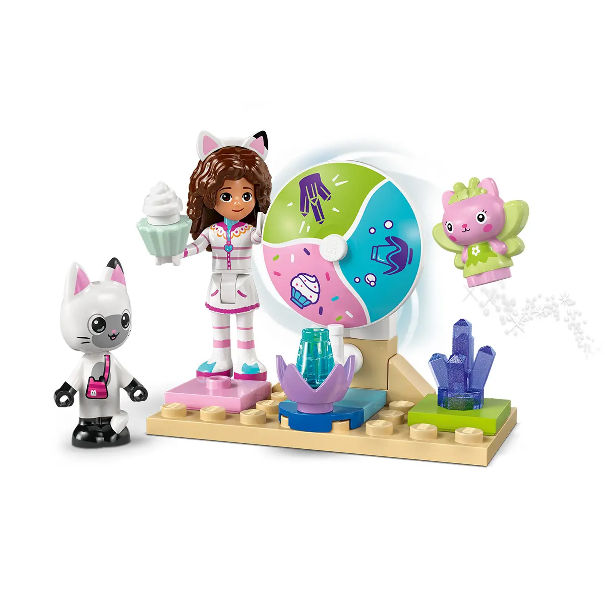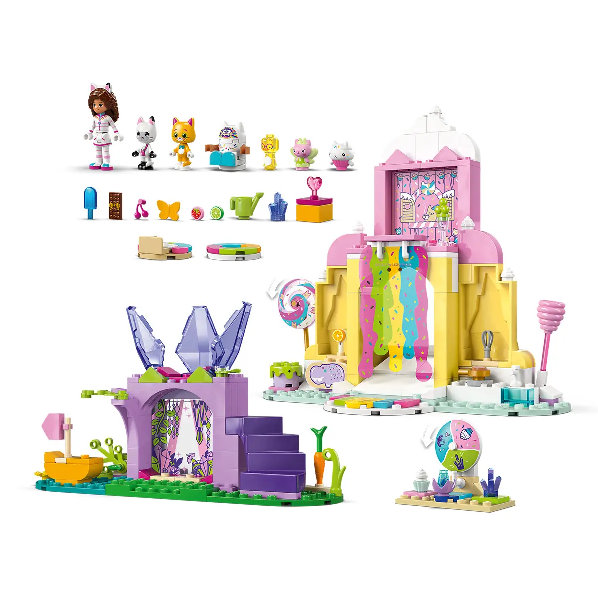 Setul creativ include 2 locații din film și multe figurine LEGO, între care Gabby, Panda-Mâț și Miau-Zâna. Muntele răsfățului dulce îi invită pe cei mici într-o lume magică a dulciurilor. Personajele pot aluneca pe gogoși printr-o cascadă colorată. Pisi Grădina este un refugiu fantastic în care Miau-Zâna stă pe tronul ei sub formă de floare de cristal și unde pietre prețioase sunt ascunse pentru a fi descoperite de copii. Instrucțiunile în imagini colorate, o cărămidă mare pentru începători și pungi separate cu câte 1 model fiecare fac experiența creativă să fie rapidă și distractivă pentru micii constructori.