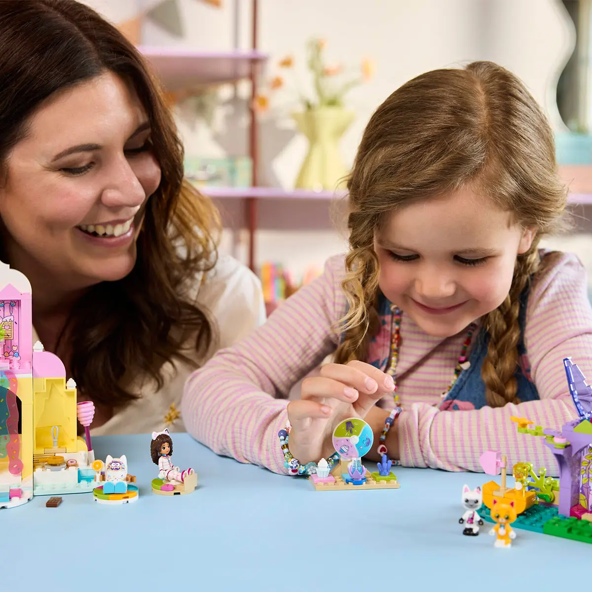 • Distracție cu Gabby și prietenii – Setul conține figurine LEGO®, între care Gabby, Panda-Mâț și Miau-Zâna, și 2 locații esențiale din Gabby’s Dollhouse: The Movie
