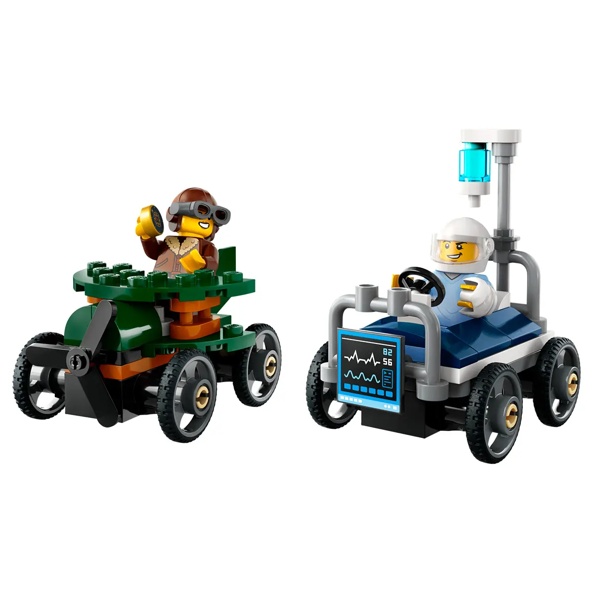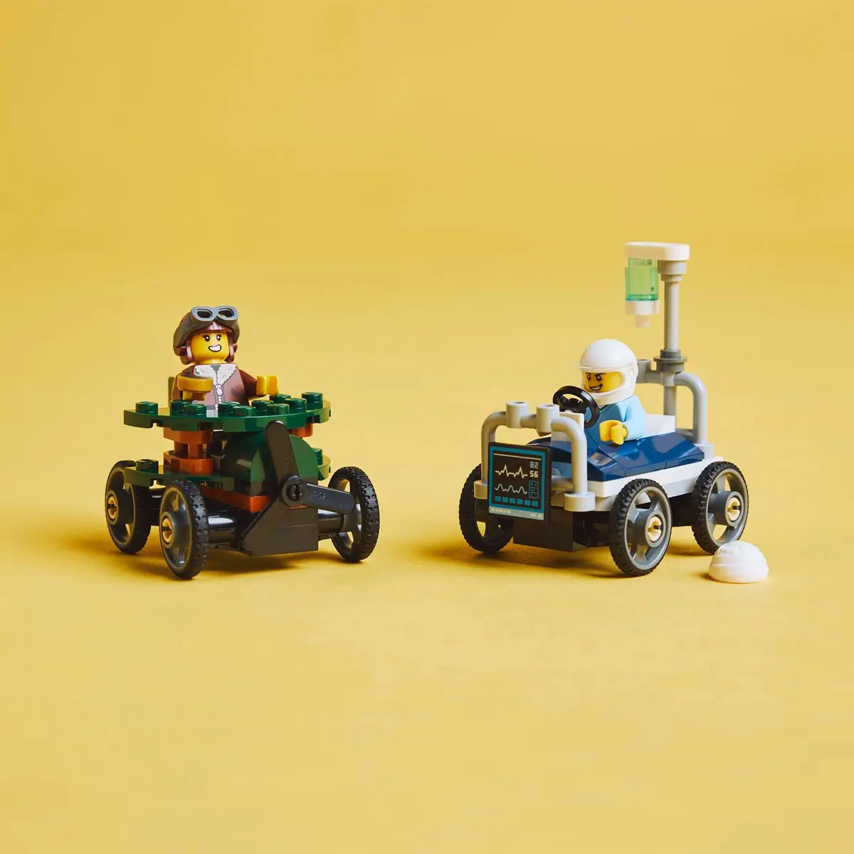 Această jucărie distractivă include 2 vehicule de curse nemotorizate și 2 minifigurine. Copiii îi înfruntă pe pilotuldin avionul în zbor și pe pacientul de pe patul de spital surprinzător de rapid. Cine va câștiga? Ocupă-ți locul și urmărește cursa urbană spectaculoasă!