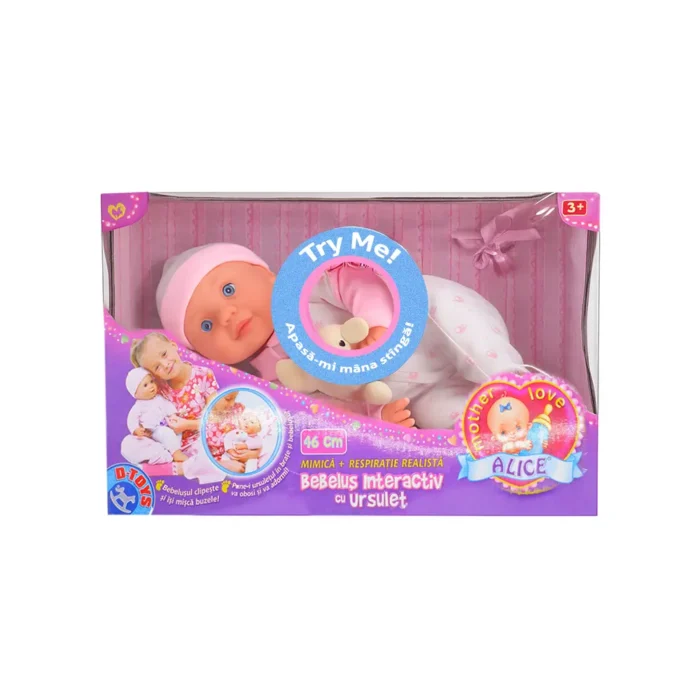 Păpușa interactivă Alice este concepută pentru a le oferi celor mici o experiență cât mai apropiată de îngrijirea unui bebeluș adevărat. Prin mimică realistă și funcții sonore blânde, copiii pot învăța, prin joc, cum să fie atenți, grijulii și afectuoși.