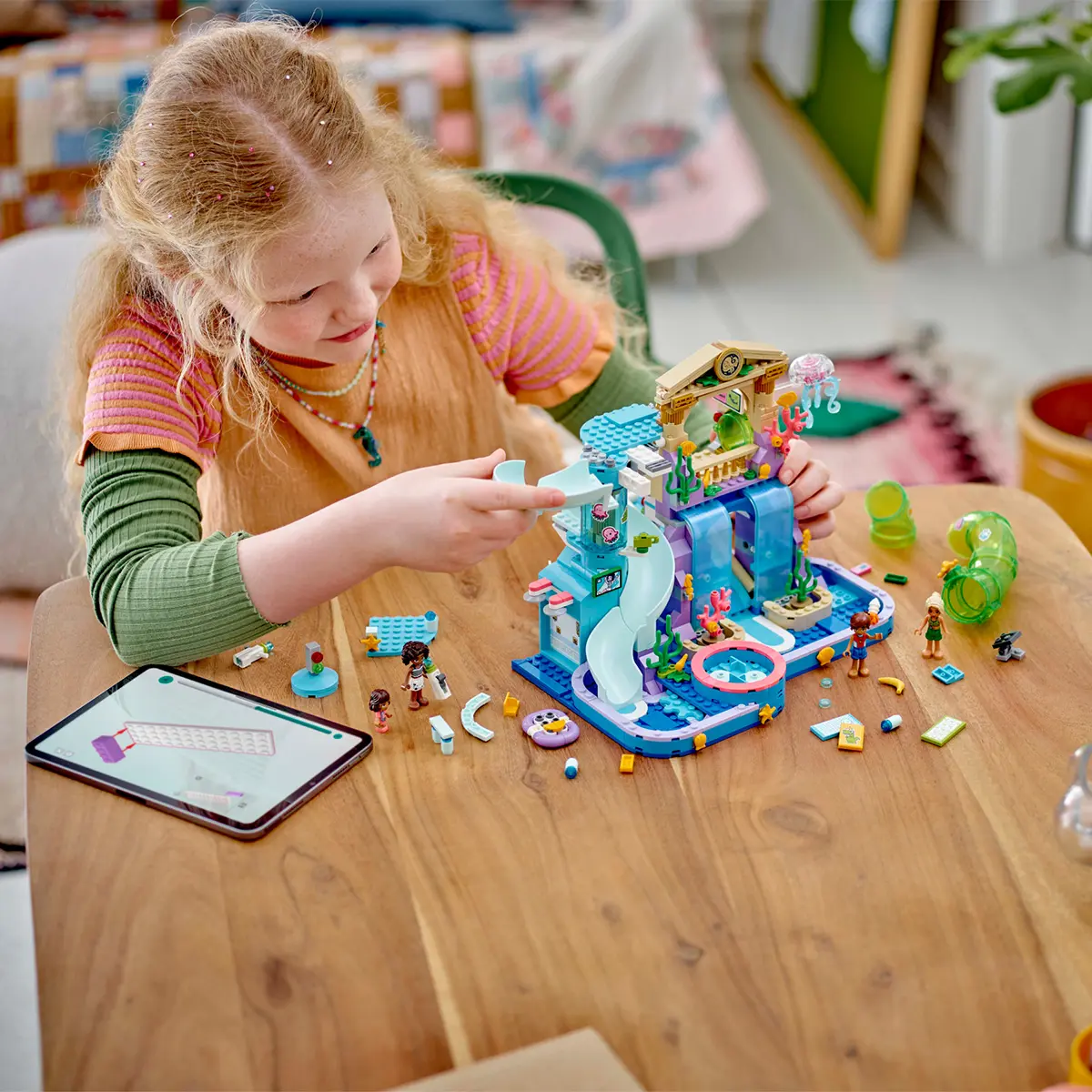 Acest set de construcție LEGO pentru copii conține o mulțime de elemente dintr-un parc acvatic, incluzând un duș, vestiare și gustări, astfel încât copiii să petreacă multe ore de joacă creativă. Descoperă mai multe cadouri zi de naștere pentru copii în gama de seturi LEGO Friends (vândute separat). Această jucărie este însoțită de aplicația LEGO Builder pentru o construcție intuitivă.