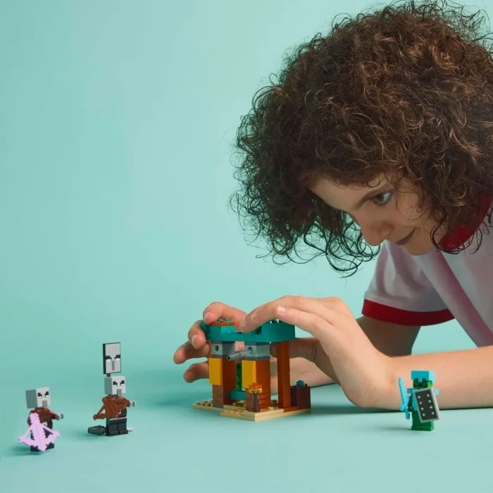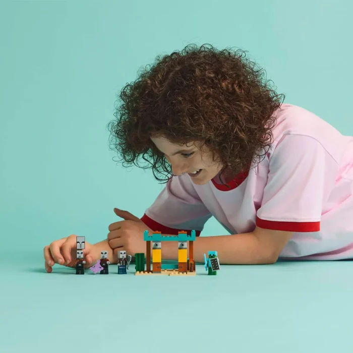 Aflați într-un avanpost dintr-un deșert Minecraft, copiii joacă rolul unui Cavaler Cactus, cu armura, scutul și sabia sa de diamant. Când 3 figurine illager sosesc pentru a fura comori, copiii trebuie să apere avanpostul. Setul include proiectile pe care cei mici le pot lansa cu un bobârnac al degetului, o varietate de arme și un butoi care conține comoara. Pentru un plus de distracție digitală, aplicația LEGO Builder le permite copiilor să apropie și să rotească modelele în 3D folosindu-și dispozitivele.