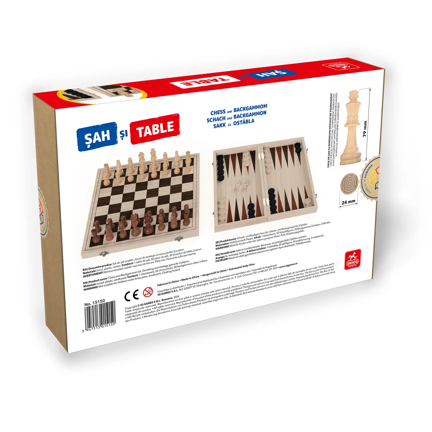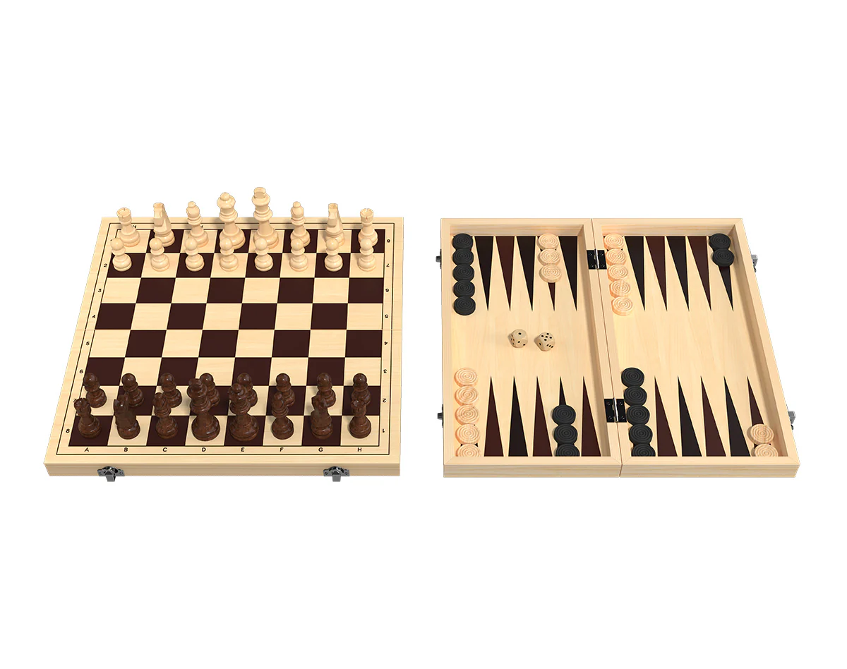 Descoperă setul elegant de șah și table, găzduit într-o cutie premium din lemn de calitate superioară. Piesele de șah și table, realizate integral din lemn, adaugă un aer de rafinament și autenticitate acestui joc clasic, ideal pentru pasionații de strategie și stil.