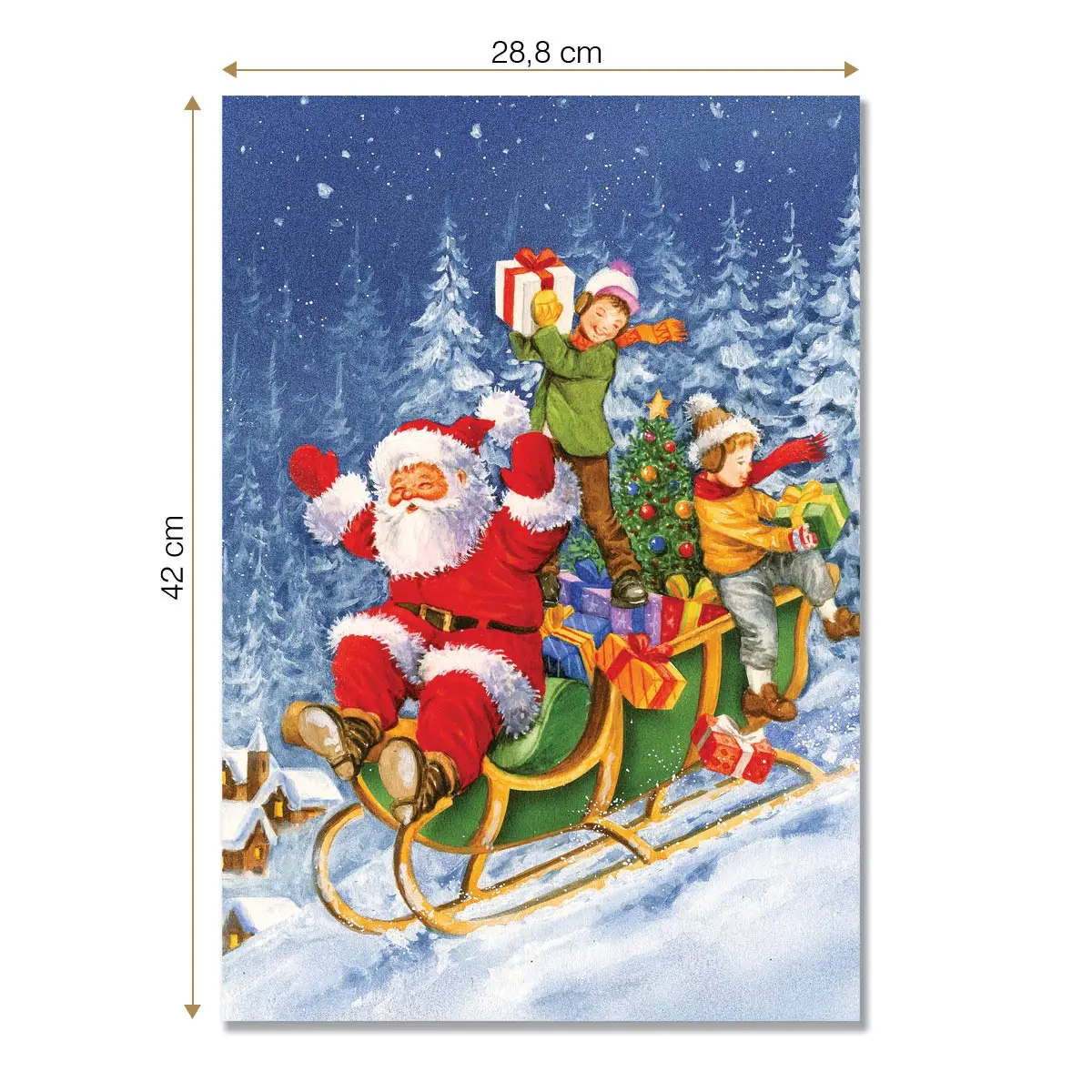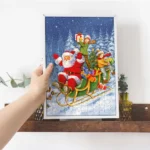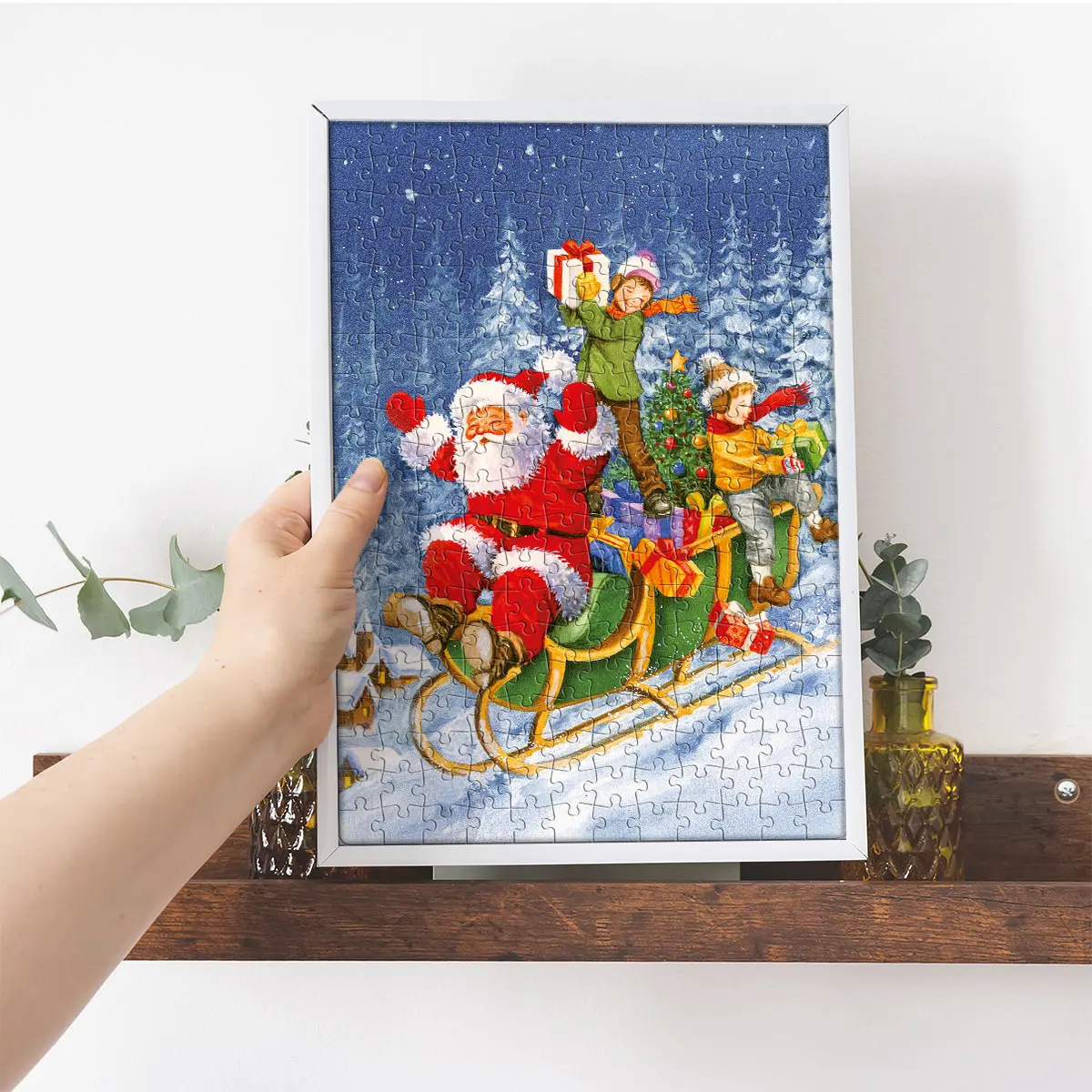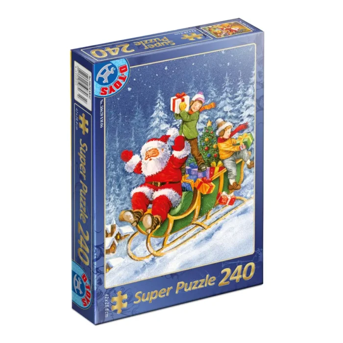 Puzzle-ul Super Crăciun de la D-Toys surprinde o scenă veselă de iarnă, cu Moșul și copiii săi ajutoare într-o sanie plină de cadouri, pornind prin pădurea acoperită de ninsoare.