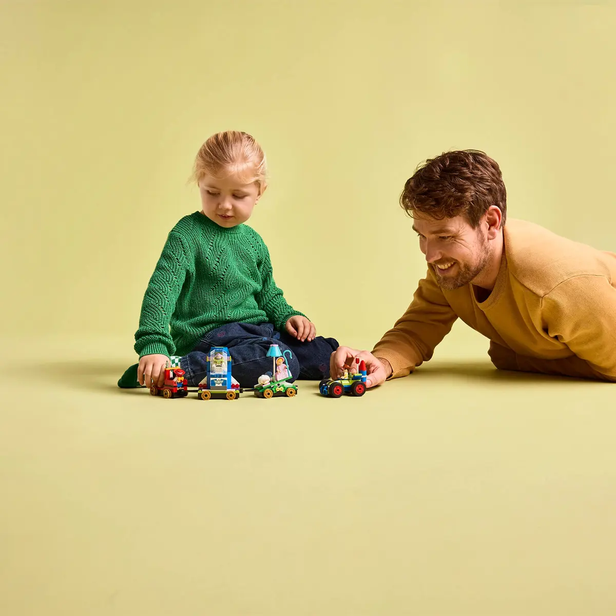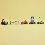 • Dotări și funcții pentru joacă – Locomotiva LEGO® ǀ Disney se atașează la cele 2 vagoane alegorice, care includ un balansoar și o navă spațială cu cockpit care se deschide, iar mașina are spațiu în spate pentru o rachetă